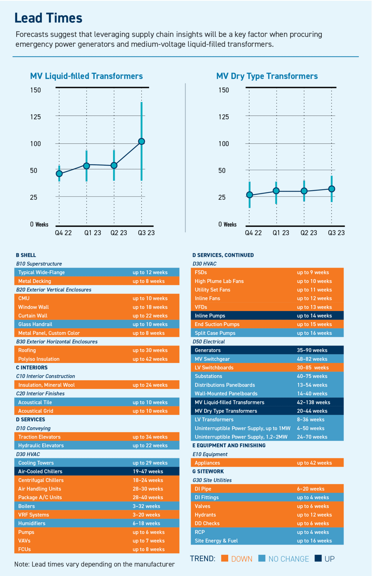 Shortened material lead times bring good news. Over 57% of tracked materials have decreased or stable lead times, with HVAC equipment showing the most significant improvements. Less than 10% of the items recorded a rise in lead times over the past quarter. The largest jumps in delivery time include large emergency power generators, rising from 70 weeks to 90 weeks, and medium voltage liquid-filled transformers, increasing from 85 weeks to 138 weeks.