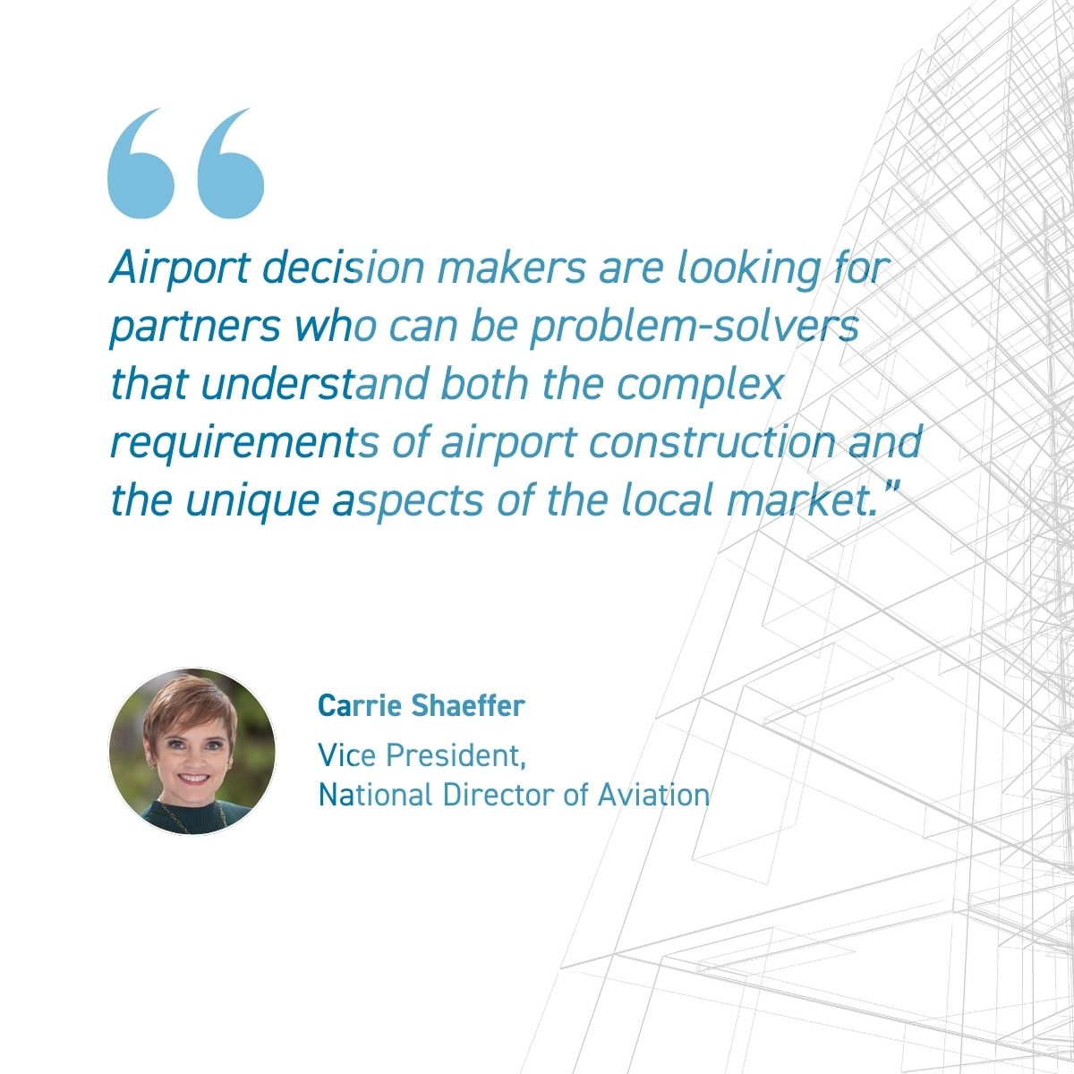 “Airport decision-makers are looking for partners who can be problem-solvers that understand both the complex requirements of airport construction and the unique aspects of the local market. We are thrilled to regularly partner with other Swinerton target markets like National Parking Structures,” says Carrie Shaeffer, National Director of Aviation.