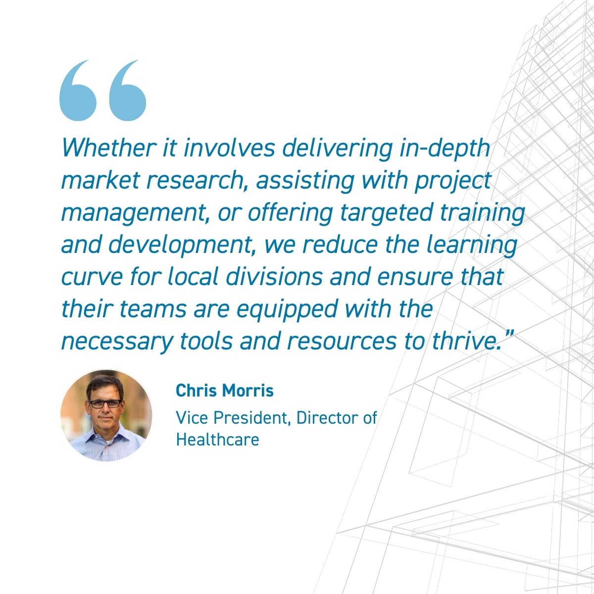 “A national approach enables effective management, ensuring that we allocate resources where they are needed most,” says Chris Morris, leader of Swinerton’s National Healthcare market. “Recognizing that each division has its unique strengths and challenges, our team provides tailored support to address these specific needs. Whether it involves delivering in-depth healthcare market research, assisting with project management, or offering targeted training and development, we reduce the learning curve for local divisions and ensure that their teams are equipped with the necessary tools and resources to thrive.”