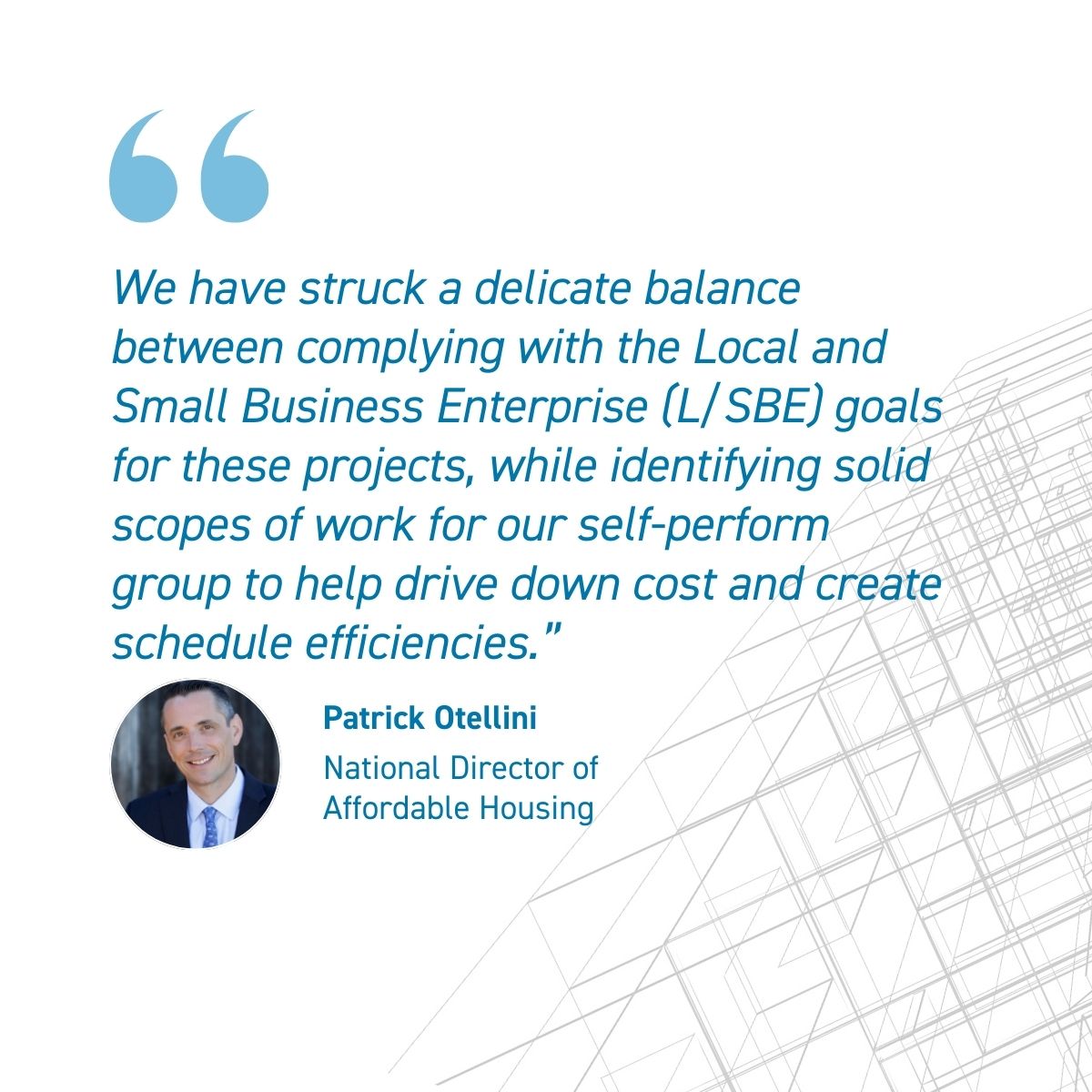 “Self-perform plays a huge role in this work,” says Patrick Otellini, Swinerton’s National Affordable Housing Director. “We have struck a delicate balance between complying with the Local and Small Business Enterprise goals for these projects, while identifying solid scopes of work for our self-perform group to help drive down cost and create schedule efficiencies. We also interface a lot with Timberlab, since many of these clients are looking at ways to build more sustainably.”