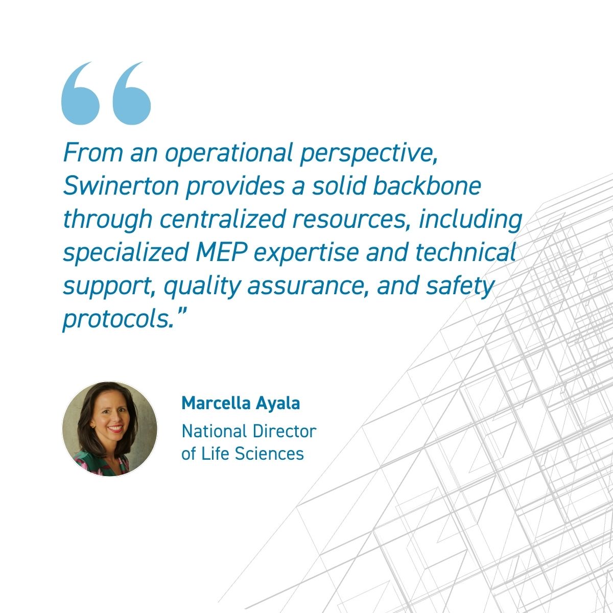 “From an operational perspective, Swinerton provides a solid backbone through centralized resources, including specialized MEP expertise and technical support, quality assurance, and safety protocols. These resources ensure that no matter where our Life Sciences clients’ projects are located, they receive the same high level of service and technical excellence that their industry demands,” Marcella adds.