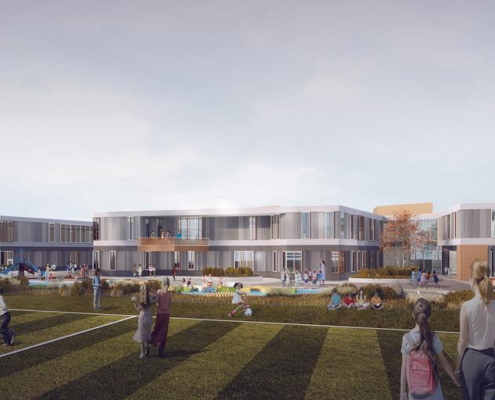 The new 19,347-square-foot single-story childcare center is a groundbreaking example of the benefits of mass timber in early education. Imagine nine lively classrooms with stunning vaulted ceilings, where clerestory windows flood the space with natural light, accentuating the warmth of timber columns and beams. Outside, timber overhangs create inviting play areas, blending seamlessly with nature.