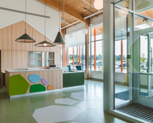 This center isn’t just beautiful—it highlights sustainability. It combines mass timber with additional eco-friendly exterior materials, native landscaping, and cutting-edge energy-efficient features like low-VOC paint, smart thermostats, and LED lighting, seeking to achieve LEED? Gold certification. This innovative approach ensures a healthy, inspiring environment for children to learn and grow.