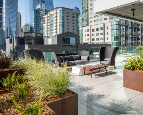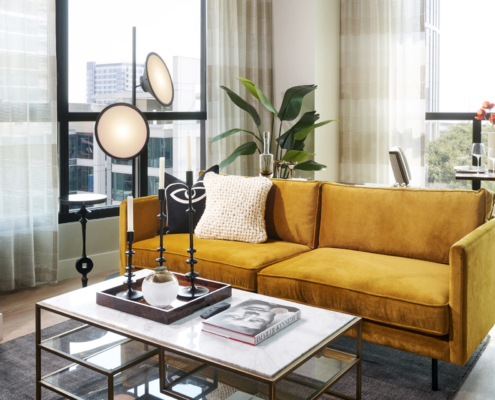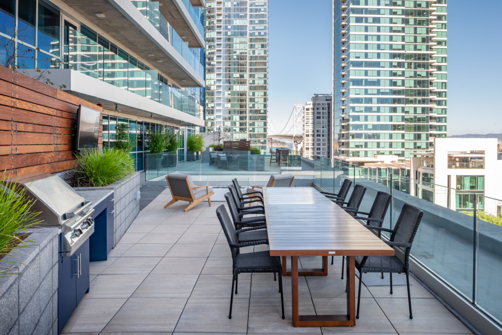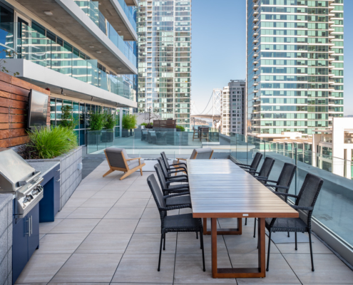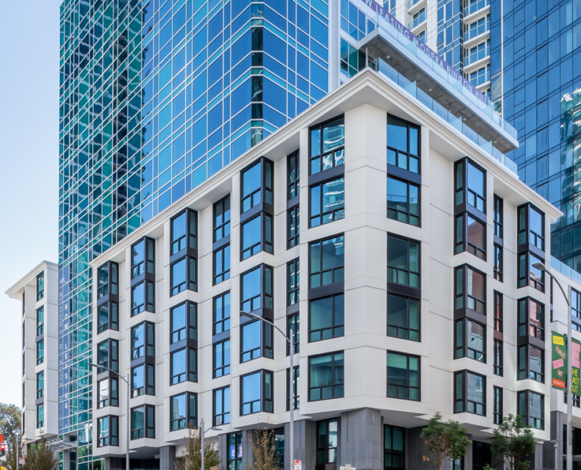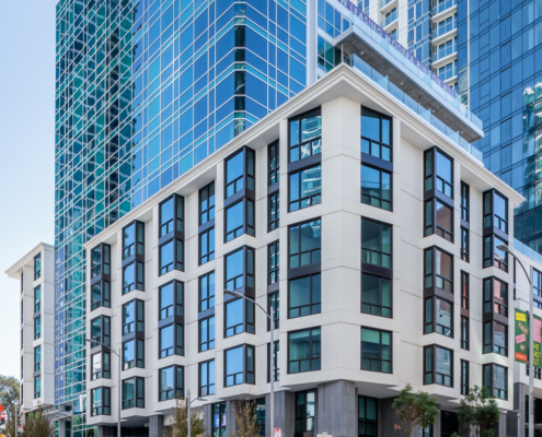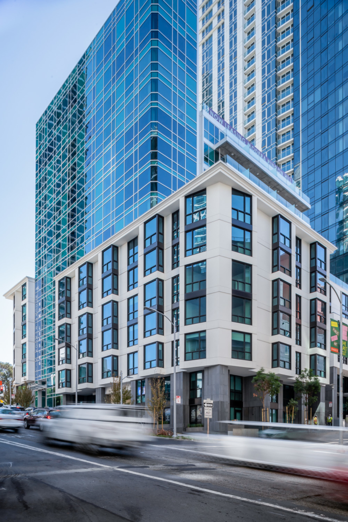 Modera | Rincon Hill is an apartment community located within two height/bulk zones in San Francisco’s Rincon Hill neighborhood. This project has a 14-story tower at First Street, with a stepped 5- to 7-story podium fronting Lansing, Harrison, and First Streets. The base element has projecting bay windows and private stoops to further scale the building to blend in with local traditional residential architecture.