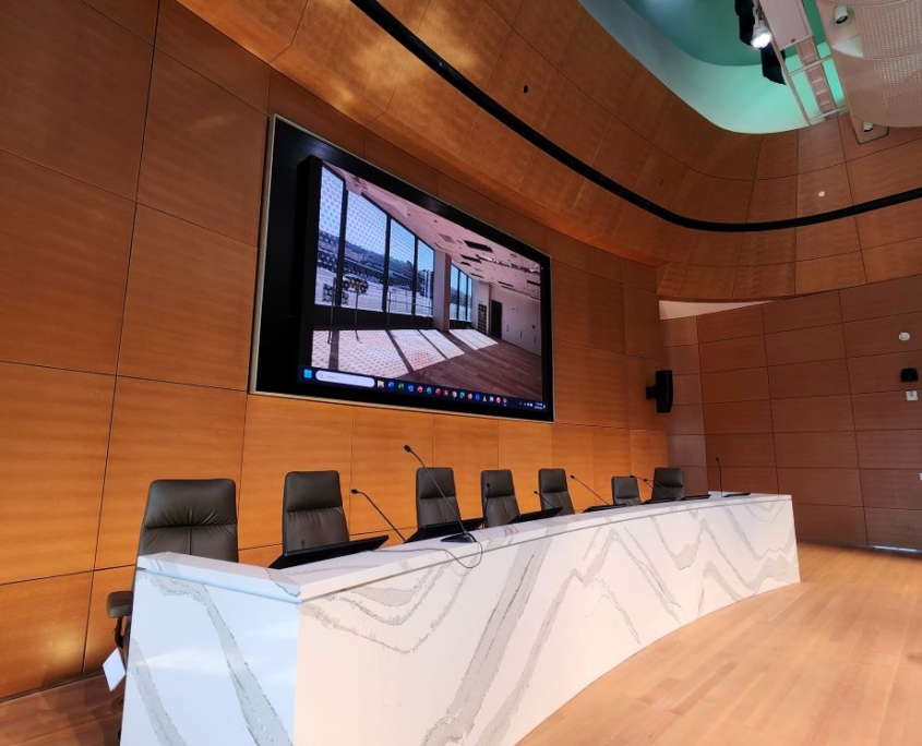 The 5,000-square-foot community theater serves as a performance area and space for the City Council chambers to hold community meetings. The 35,000-square-foot parks and recreation center houses small, medium, and large classrooms, music rooms, and exercise/dance spaces, along with 1.3 acres of developed parkland. The large hub provides a central welcome space for the entire facility, including areas for small lectures, receptions, and galleries.