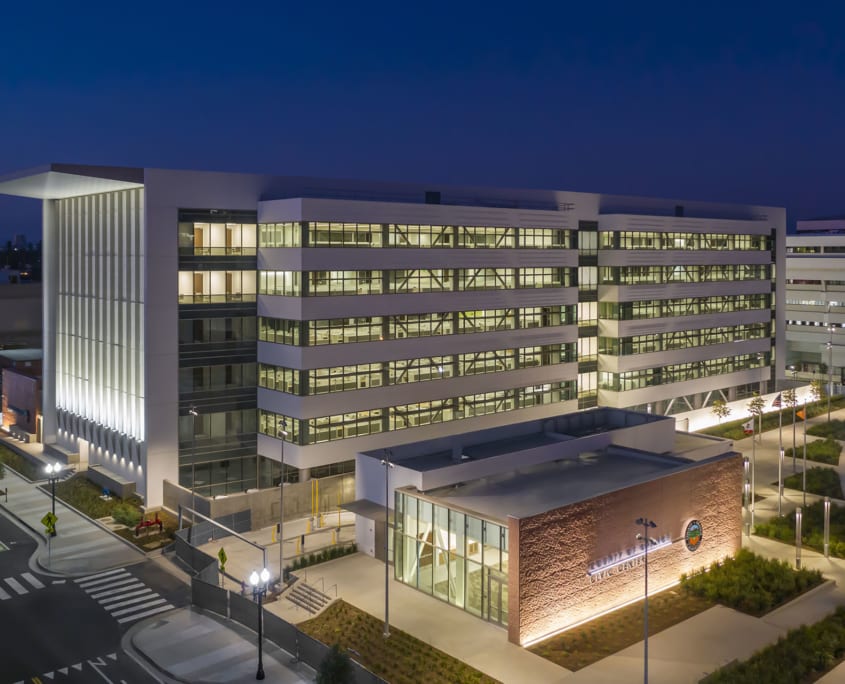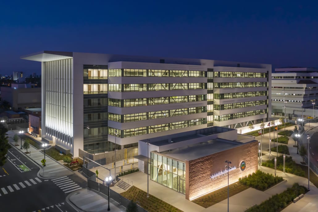 The new six-story building features 250,000 square feet of office space. Built with an extensive glass fa?ade, the building is infused with natural daylight and provides views for all occupants. Enclosed offices are centralized within the core of the building, with workstations located along the building perimeter to improve flexibility. The building also includes a 240-person conference and event center for both County agencies and the public. The building sits atop a two-story, 150,000-square-foot underground parking structure with 350 stalls. Achieving LEED Silver, the building performs 70% better than a typical office building in the country.