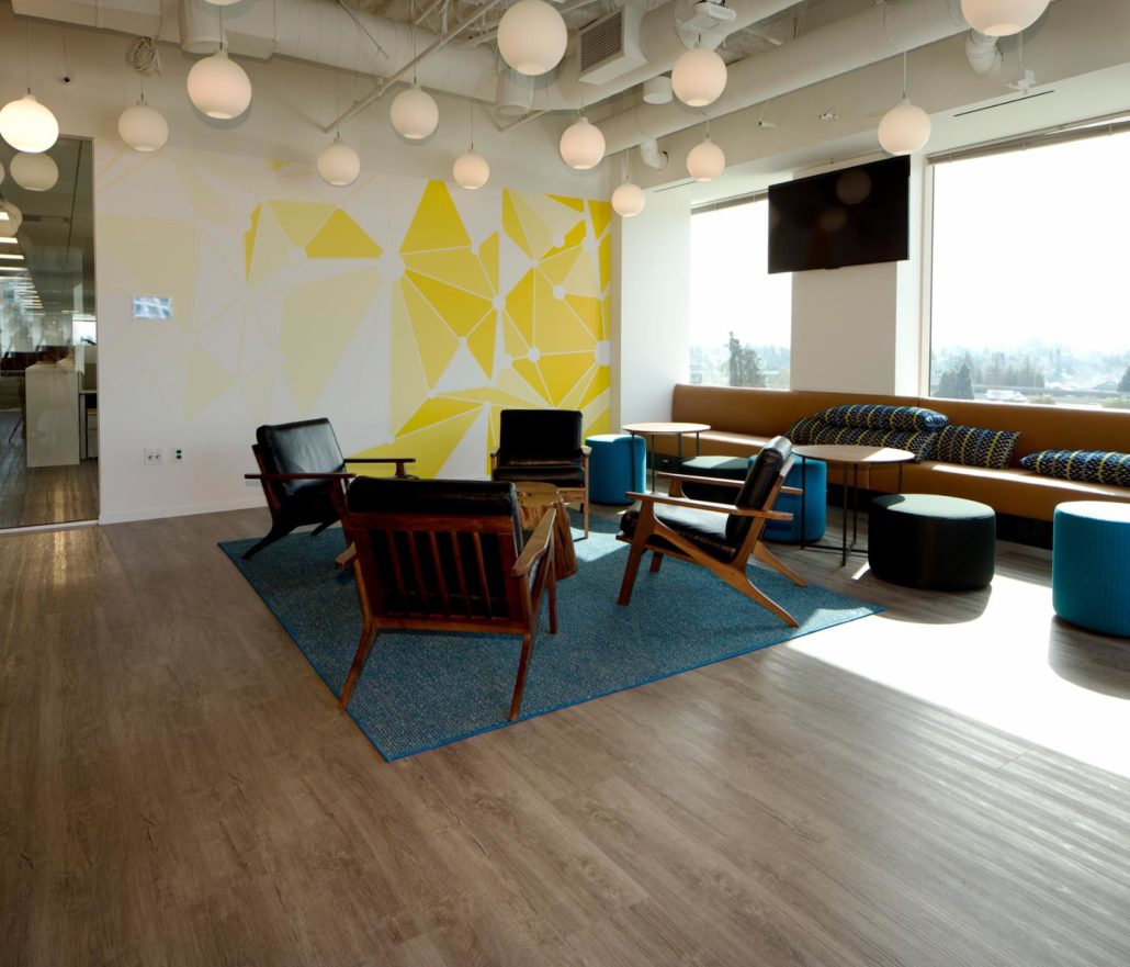 Office, Collaborative Space, Benetti Moss Wall, Contemporary Wall Mural, Live Edge Wood Countertops, Wood Trellis