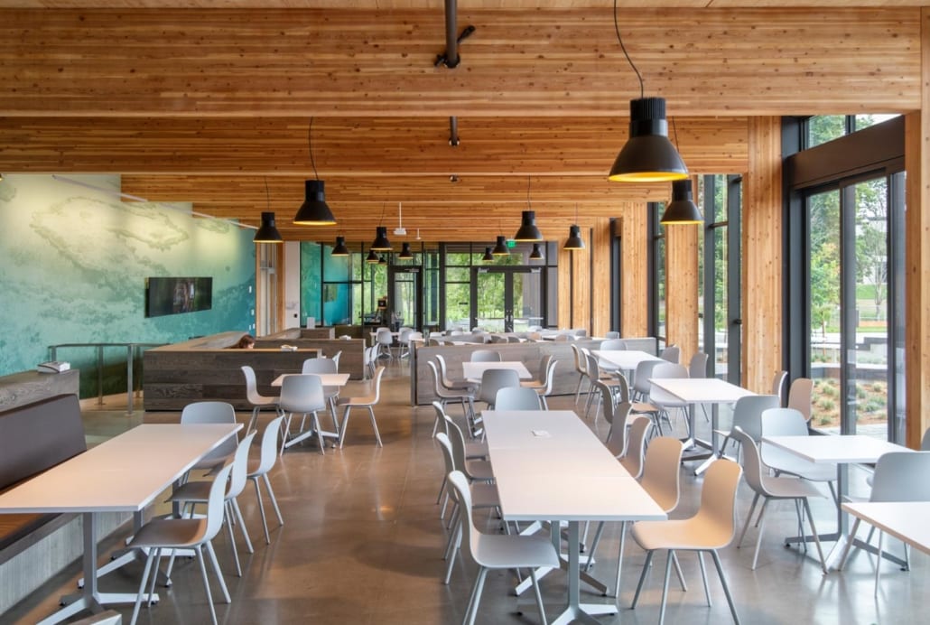With a utilization goal of 160 square feet per employee, the office interior features open, collaborative spaces with minimal private offices. The building’s raised access floor system houses all MEPF and low-voltage systems, which allows for a clean and exposed CLT ceiling. The project also features a new design-build parking structure with 530 stalls. It is highlighted by high-performance metal fin cladding material, an illuminated stair structure, and a fiberglass window system. Swinerton self-performed the cast-in-place concrete for the parking structure.