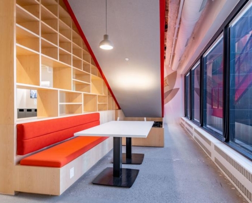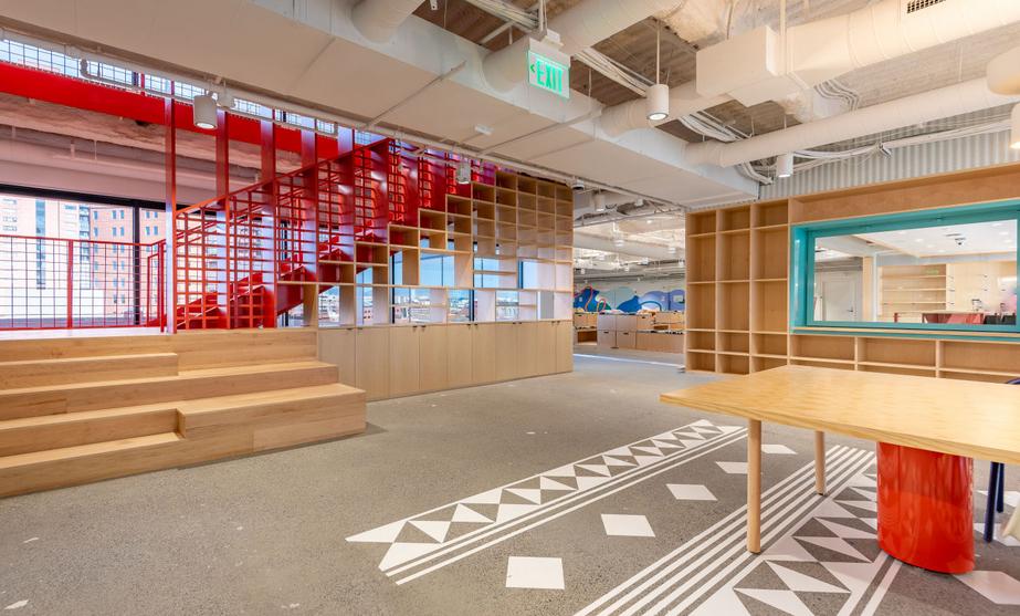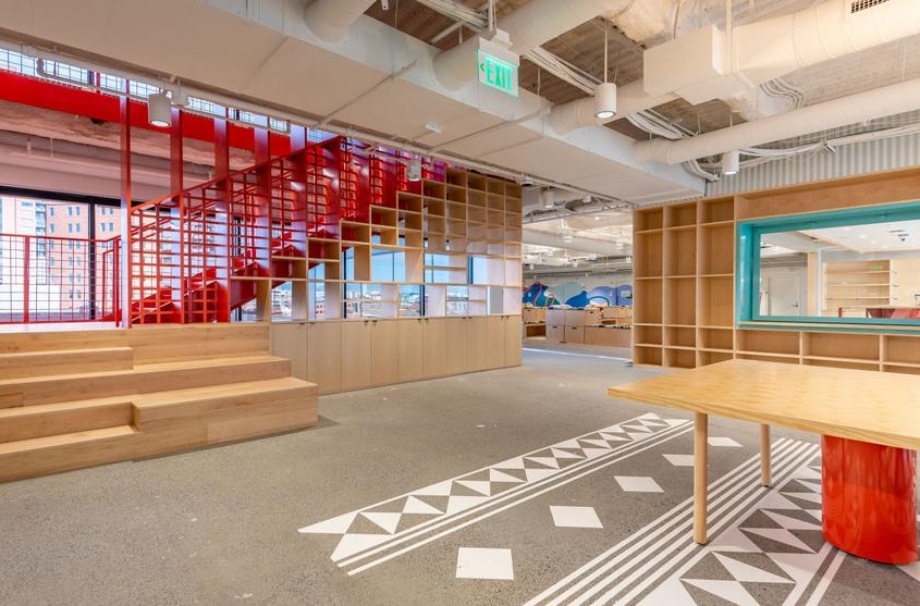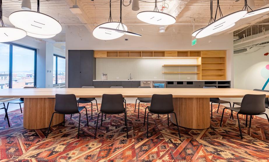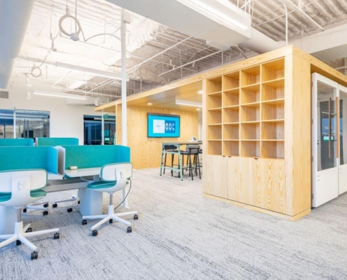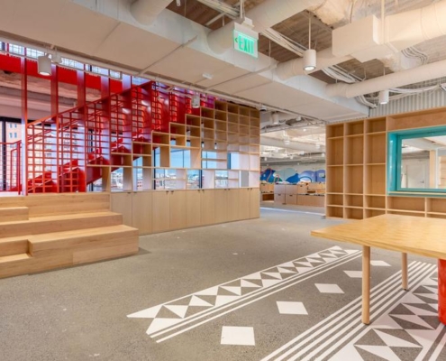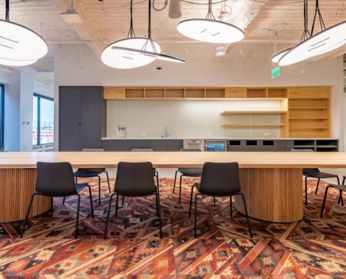 A 34,000-square-foot office build-out with Gensler that includes an interstitial stair connecting the level 6 office to level 5, with conference and huddle rooms, open office design, new restrooms, kitchens, millwork and collab booths. The scope of work included the demolition of the existing space, new carpet, and tile, polished concrete with epoxy graphics, architectural millwork features, wall murals, a holographic sign, acoustical wall panels (stretched fabric), overhead coiling door, and custom writeable walls.