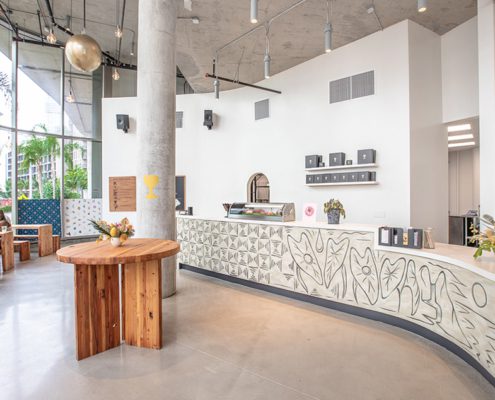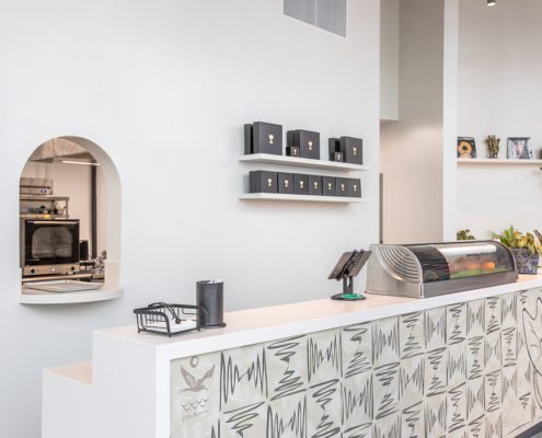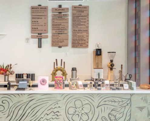 Core and Shell, Kitchen, service bar, dining area, Vinyl flooring, glass display counters, Wood paneling, cabinetry, casework, Lighting, paint, D/F/H, finishes, MEP
