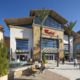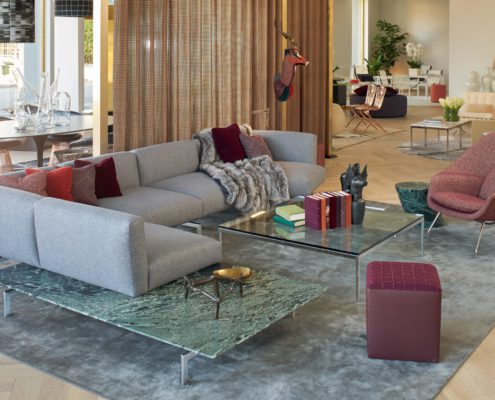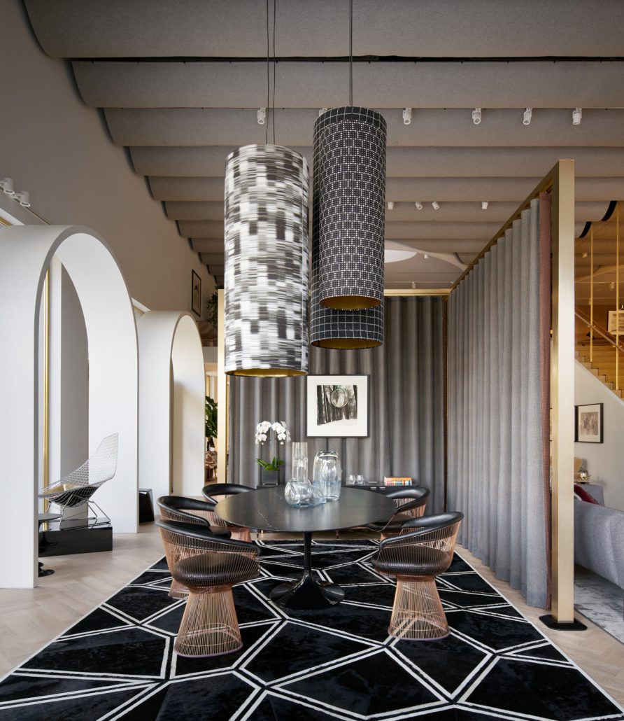 A series of white free-standing archways behind the glazed frontage mimic those at York Castle in Tangier, Morocco, and frame discrete furniture tableaus. An innovative modulated system of draped felt panels from FilzFelt was installed to define the ceiling, echoing the simple fabric canopies of traditional Italian festivals and park pavilions. Existing rooftop HVAC units were also relocated and new mechanical distribution systems were installed.