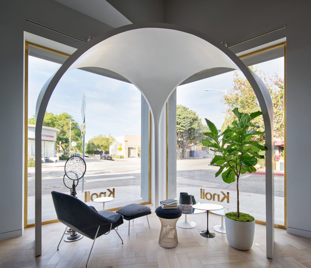 After a complete interior demolition, a full buildout transformed the 5,000-square-foot, two-level space into an extremely high-end retail store. The existing stair was removed and replaced with a new architectural stair and new skylights were added. High-end interiors and fixtures include golden-toned mirrors within brass trims on all walls; new herringbone oak wood flooring; and a display arch constructed with tube steel. An innovative modulated system of draped felt panels defines the ceiling, while free-standing archways stand behind the glazed frontage.