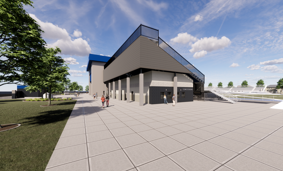 Key facilities include the 3,600-square-foot west wing with concessions, restrooms, and training areas; 3,600-square-foot east wing featuring locker rooms and storage; 2,800-square-foot, two-story press box with new ADA elevator access; dual ticket booths; and an 11,500-square-foot fieldhouse providing expanded locker and training facilities.