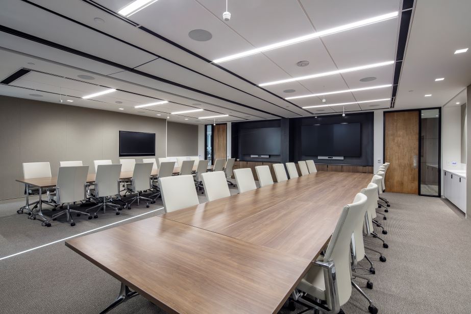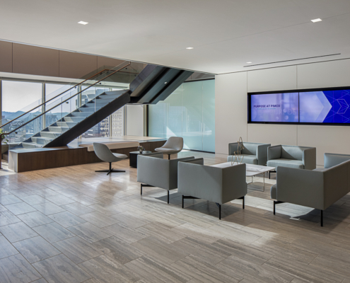 Swinerton renovated PIMCO offices on the 22nd and 23rd floors in one of Austin’s most iconic buildings. Designed by Gensler, this 47,000-square-foot project consists of open and closed offices, conference rooms, a café, and break area, and a new reception area. The space includes an interconnecting staircase along with a leather-wrapped handrail to tie in the break area to reception. One of the meeting rooms features a hidden entry door, custom-made by our millworker for that space. The breakroom incorporates a custom-designed light piece by Gensler that hangs over the island.