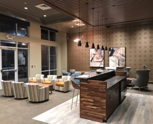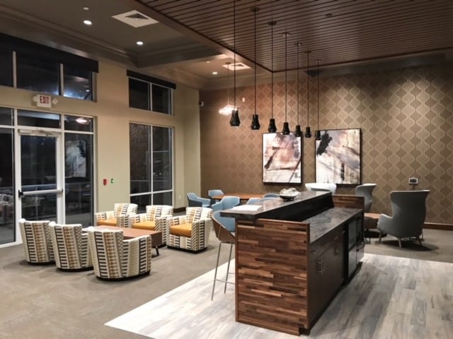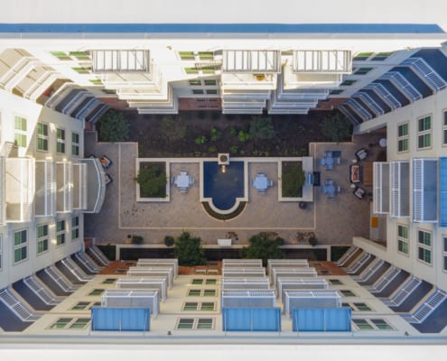 The two buildings, bisected by a city street, have a variety of exterior finishes including stucco, king brick, and cast stone over partial podium. Each building was designed to preserve the diverse character of the neighborhood. The new residential community contains 14,639 square feet of retail space and a precast parking structure with 651 parking spaces. Along with the leasing office and workroom, other amenities will include three courtyards with fountains and grilling areas, entertaining space, dog turf/walk/wash, a fitness center offering group classes to residents, and a paseo area.