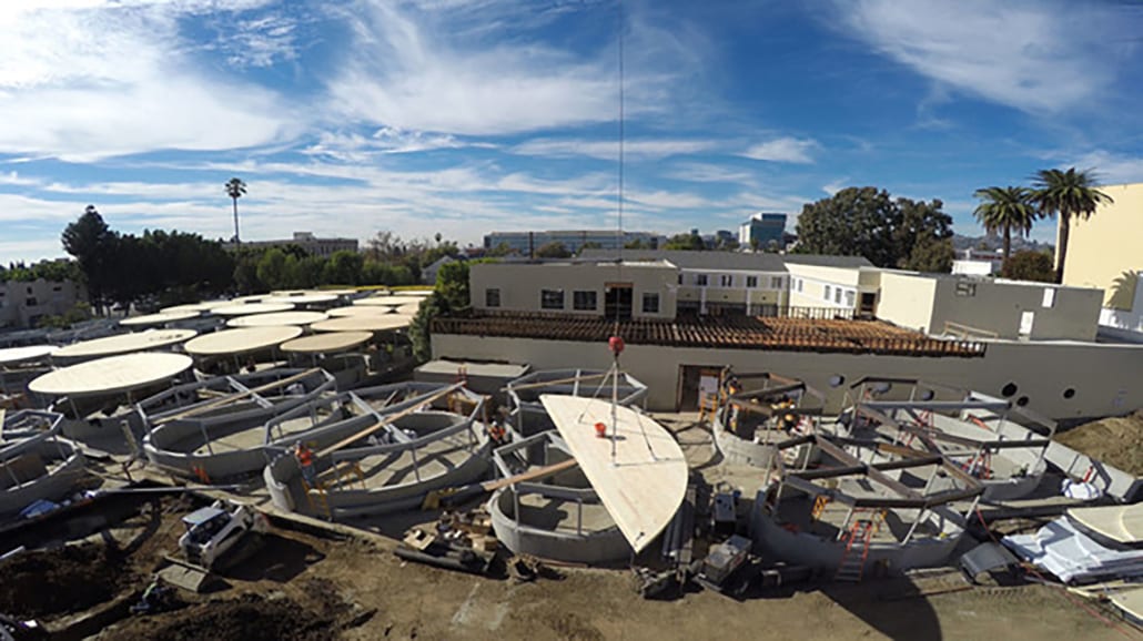 This 54,500-square-foot urban jungle in Hollywood, CA, consists of 60 new bungalows comprised of concrete retaining walls, steel structure, acrylic exterior panels, and CLT Roof Panels. The project also includes the structural retrofit of an existing below-grade parking garage to serve the collaborative needs of Hollywood’s creatives. This project represents the first use of CLT in Los Angeles County.