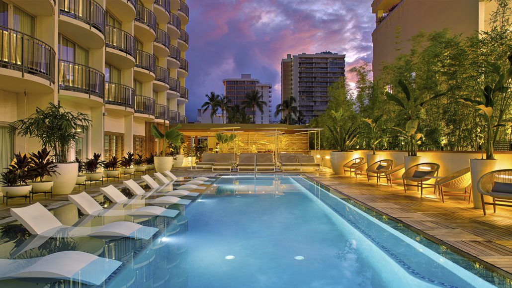 The scope of work involved the complete renovation and modernization of a 16-story, 250-room hotel with new guestroom, retail areas. The street level includes more than 10,000-square-foot of retail space, additional back of house/service areas and a 500-squarefoot lanai. On the 2nd floor lobby level a pool deck, fitness area, spa rooms, kitchen and offices, dining area, and a lounge/bar are featured. Through the design process furnishings and finishes were carefully selected to create a strong sense of rustic Hawaiian luxury, while keeping the hotel stylish and sophisticated. A 20,500-square-foot parking garage for hotel guests and shoppers is located just below street level.