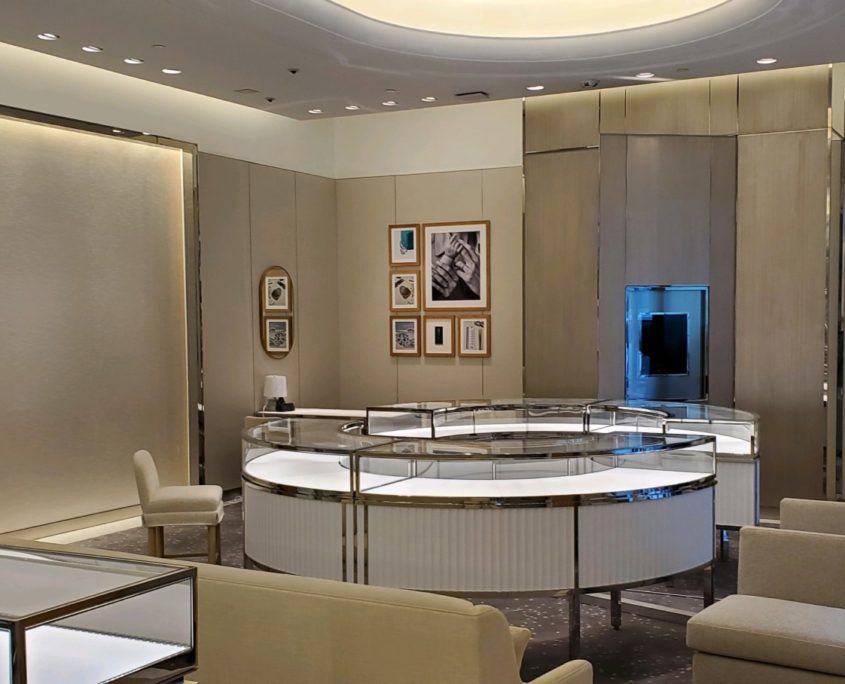 Plano Texas was selected as a flagship location due to the rapid population growth in North Texas. Tiffany & Co. stands out in Legacy West as the only luxury jeweler in the area. Surrounded by a glass facade that shows the sparkling diamonds inside, the store is lit with natural light and filled with display cases showing off Tiffany’s latest designs.