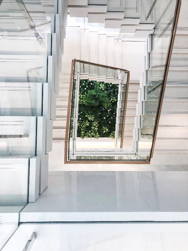 One of the store’s main features includes a three-level floating staircase, which included stainless steel hand rails, glass guard rails, and stone stairs. To ensure precise construction of the floating staircase, a 3D model was developed and reevaluated by the design team. The construction of the staircase was built within 1/16” tolerances. This model was crucial in building a one-level mock-up in Spokane, Washington and ensuring a high level of execution at the Waikiki store.