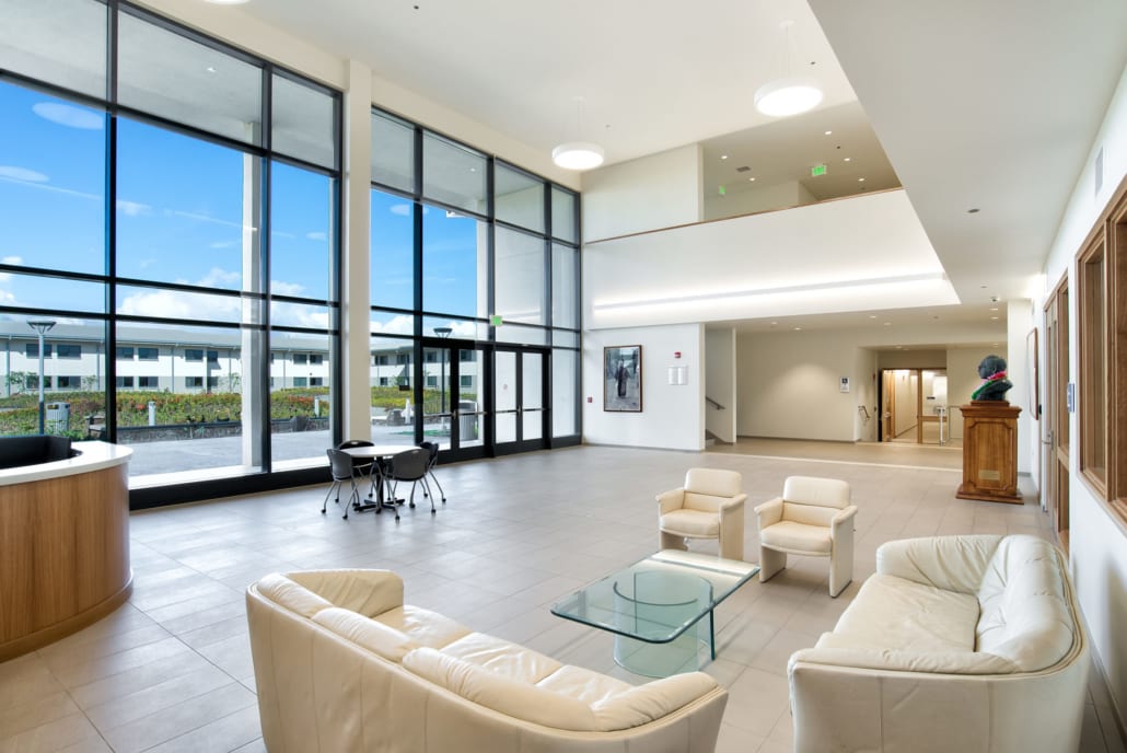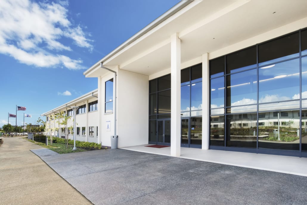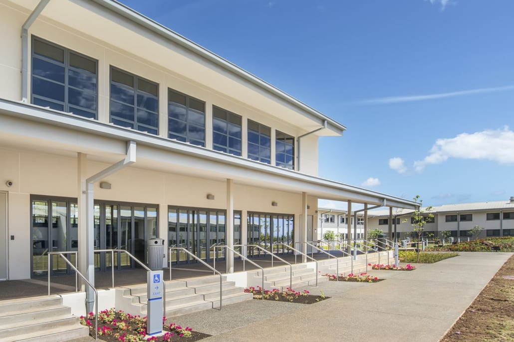 Hawaii Tokai International College is a state-of-the-art, 85,000 square foot, sustainable campus on three acres of University of Hawaii West Oahu land. The college has recently relocated from its Honolulu site on Kapiolani Boulevard. Swinerton also self-performed the concrete scopes; pouring concrete slabs for the entire campus that included the multi-purpose room, administrative office, and student dormitories. The 20,000-square-foot multi-purpose room consisted of a metal structure with podium and served as a gymnasium and campus hall. The two-level Office/Administration building and student dormitories were built using CMU concrete and framing.