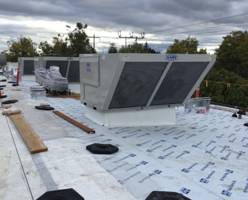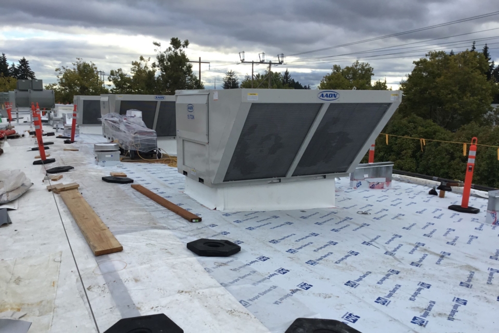 A highly complicated project, the new building required permanent shoring with concrete foundations, along with sophisticated mechanical systems. This included 90 tons of cooling; a large amount of exhaust for high heat spaces; mechanical process piping for H2/O2/CDA/NG lines; a sanitary lift station; and an Inergen system for gas detection monitoring and response. The building envelope was also highly technical in nature. It consisted of a double firewall; seismic expansion joints; and an upgraded structural frame. A new roof was also built over the renovated portion, as the prefabricated 1970s metal shed building could no longer support the large amount of added rooftop equipment. The new roof required the addition of 48” of built-up insulation to allow it to properly drain changing slope direction, while also integrating it with the roof of the new building.