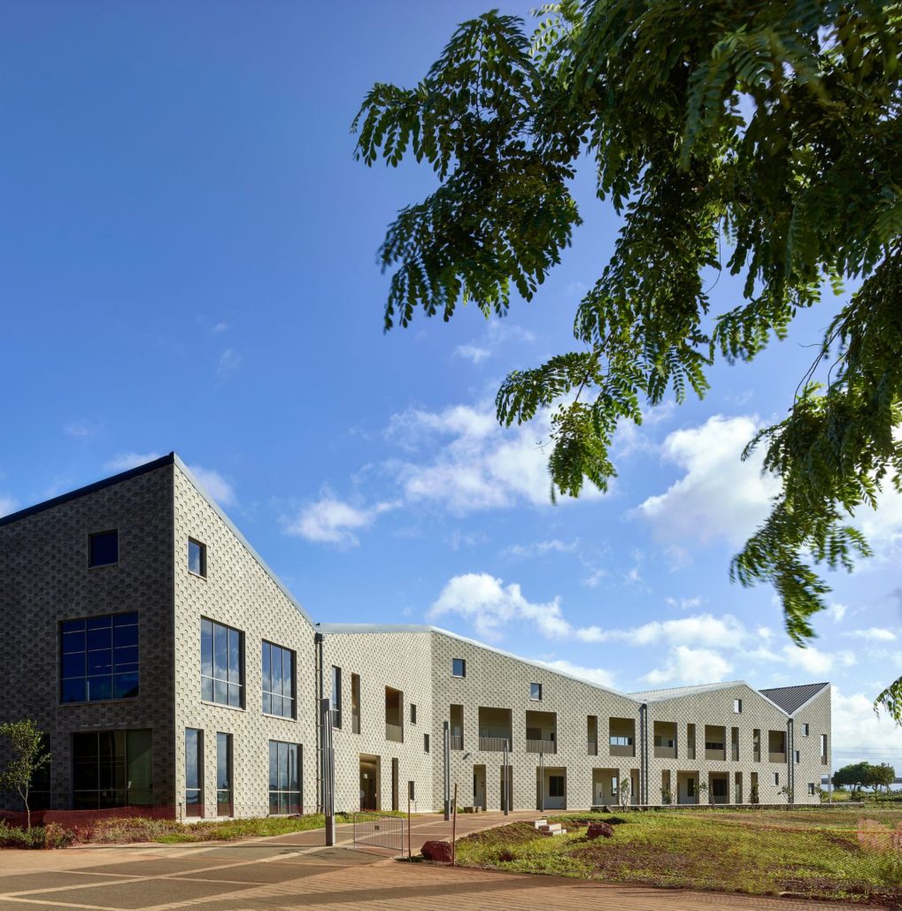 The Administration and Allied Health Facility (AAHF) at the University of Hawaii West Oahu (UHWO) campus consists of a two-story 43,442-square foot learning and office facility. Designed by architecture firms Perkins+Wills and KYA Design, the newly constructed building features the gable roof style that draws upon the architecture of sugar mills that once dotted Oahu, while the exterior masonry incorporates angular patterns that recall those on kapa, or traditional Hawaiian bark cloth, while the expansive second floor lanai features architecturally designed wood slat ceilings. Prior to its construction, UHWO Human Resources and administrative staff were based off-campus until the AAHF building was completed. The new Administrative and Allied Health Facility now provides substantial office space to sustain the programs of the growing campus and a brand new facility that will foster the health sciences program for many years to come.