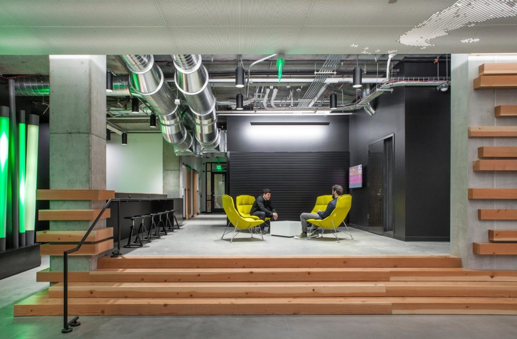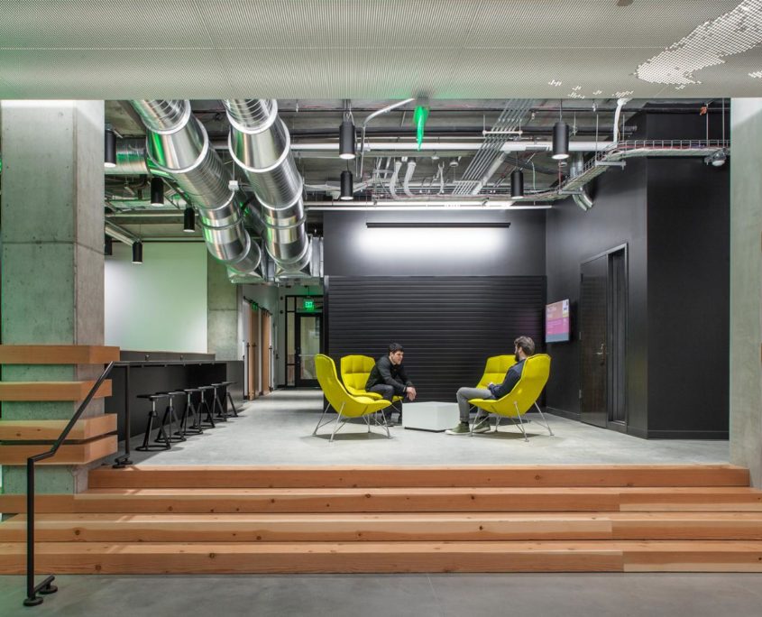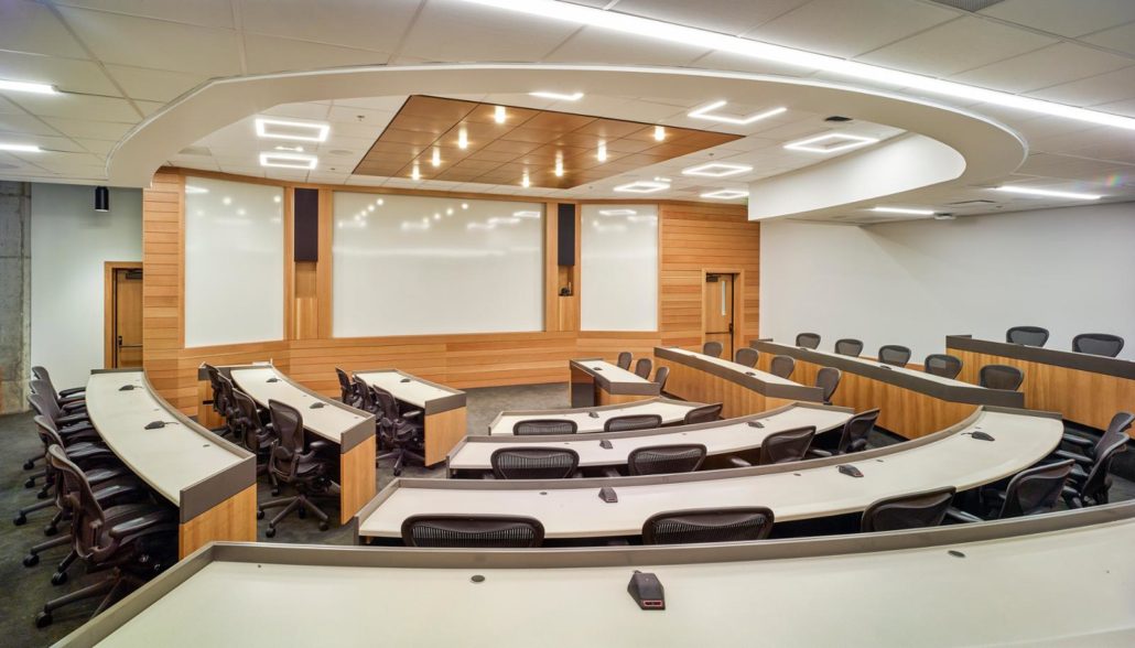 Graduate Level Learning Spaces, Exposed Ceilings, Polished Concrete Floors, Rolling Barn Doors, Back Painted Glass, Lumber Feature Wall, Urban Location