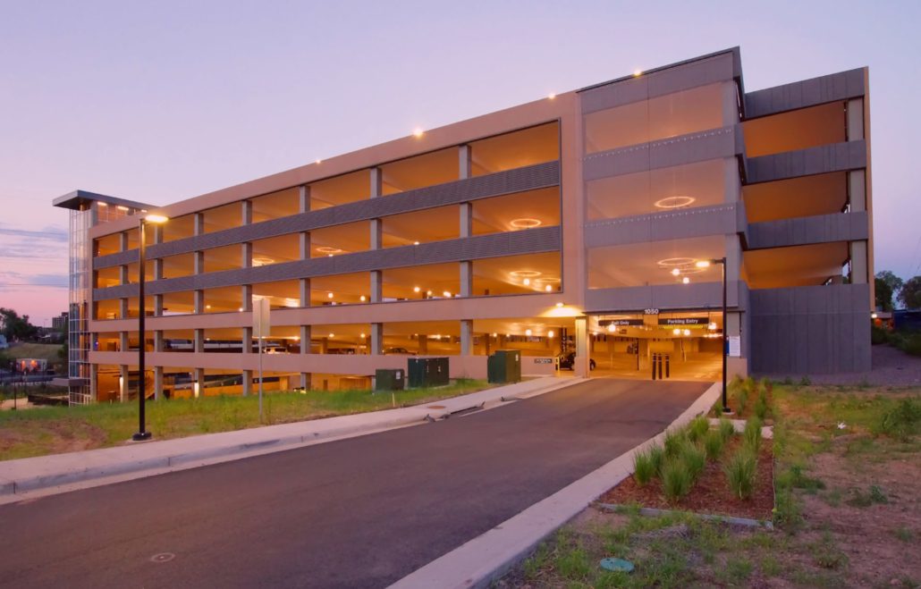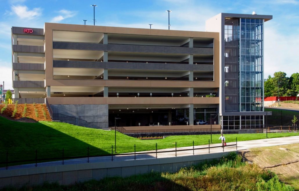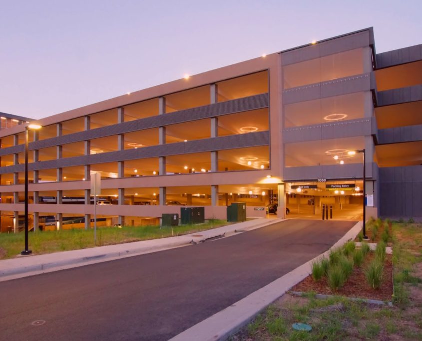 Swinerton provided design-build general contracting services for the construction of a new six-level, 262,644-square-foot parking structure with 817 stalls. It was one of two design-build structures Swinerton built to meet the schedule for the grand opening of RTD’s West Rail Line. Utilizing cast-in-place concrete, the exteriors are made of colored architectural precast concrete panels, stainless steel panels, and aluminum storefront framing and glass. The structure also contains two stair cores and a pair of elevators. The 70-degree parking layout offers improved wayfinding and safety measures. A new pedestrian plaza off the northwest corner of the building ties into a circulation path from the parking structure to the light rail station. For natural ventilation purposes, the exterior has uniformly distributed openings on two sides that make up a minimum of 20% of the total perimeter wall area of each tier. The structure also features rough-in for future photovoltaic systems and electric car charging stations.
