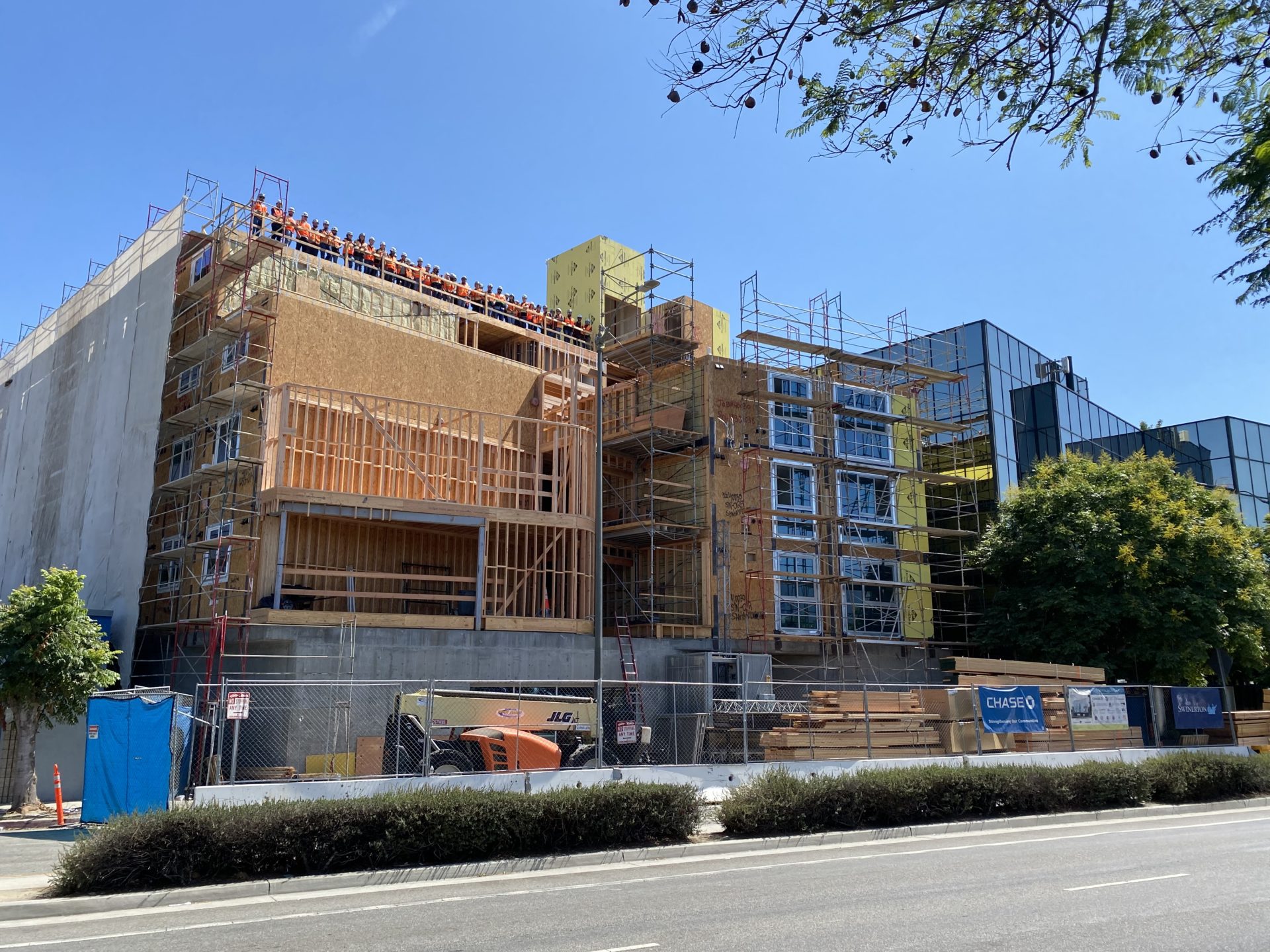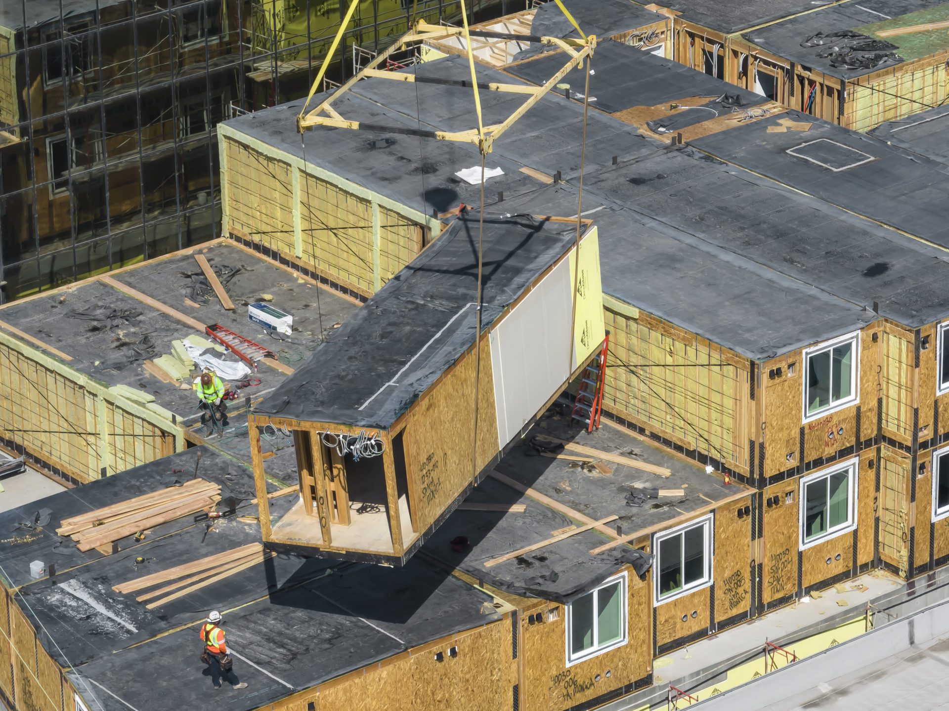 On July 6, 2021, the Swinerton team broke ground with Los Angeles Mayor Eric Garcetti in attendance. Just under a year later, on June 23, the project began setting the modular units at the construction site. These units were prefabricated at an offsite facility 80 miles from the project site in Perris, CA. Within 10 days, all 51 units of the five-story apartment building were set by crane, and the building elevation grew from Level 1 to Level 5. The current remaining scope includes the structural connections of the modular units, roof installation, miscellaneous onsite interior finishes, exterior skin, and the elevator.